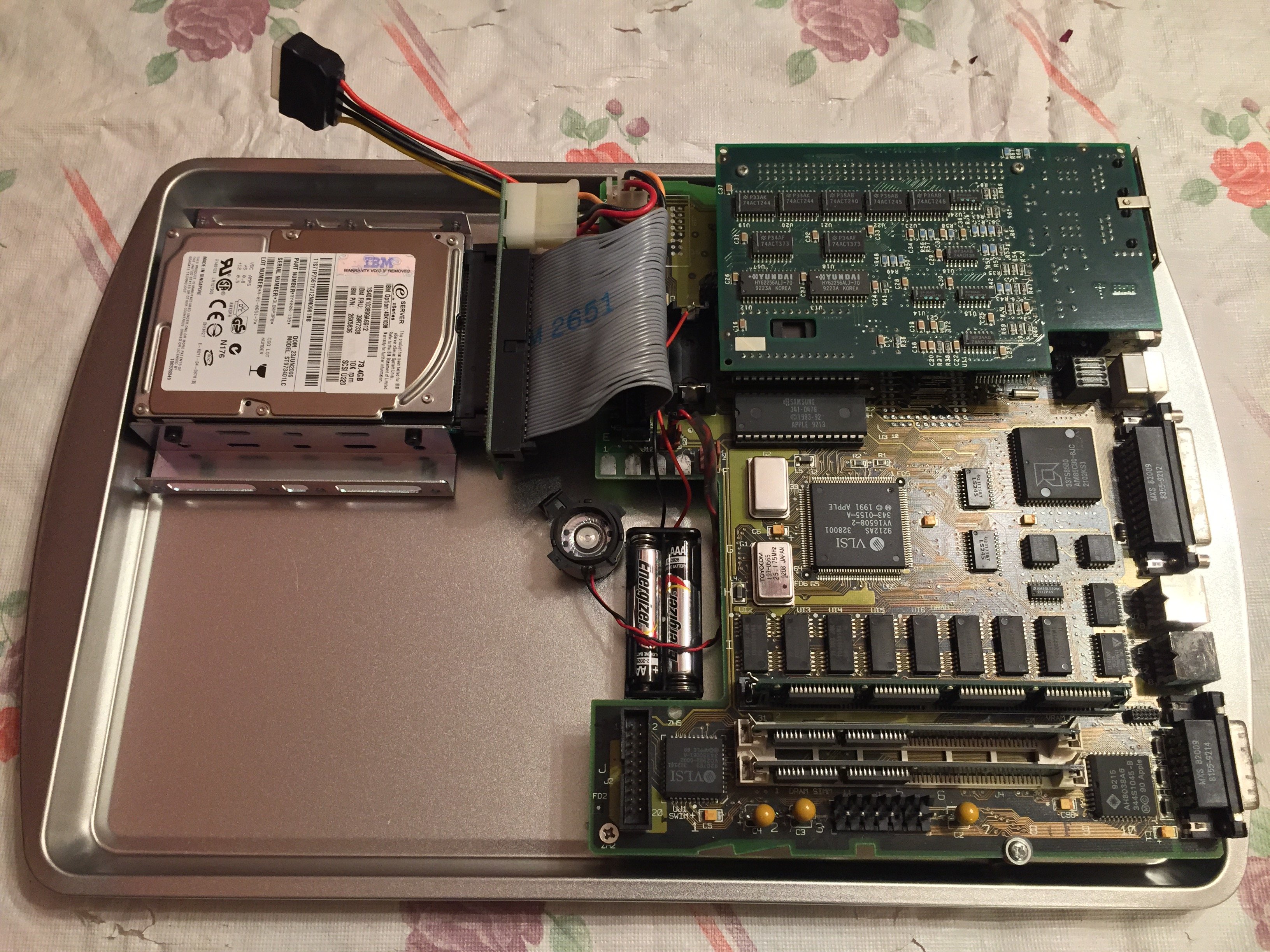 This rescued Mac LC II was given to me by someone who thought he didn't have the skill to repair it, since it was heavily oxidized and had damage from battery acid and capacitor goo. I cleaned it up and installed new capacitors, and it ran! Because it had no case, I then built it on to a dollar store tray, gave it batteries, a speaker, a SCSI drive, a Mac-to-VGA adapter, an LC PDS ethernet card, an m68881 math coprocessor and two four meg, 30 pin SIMMs. Although it physically has 12 megs of memory, only 10 are usable. |